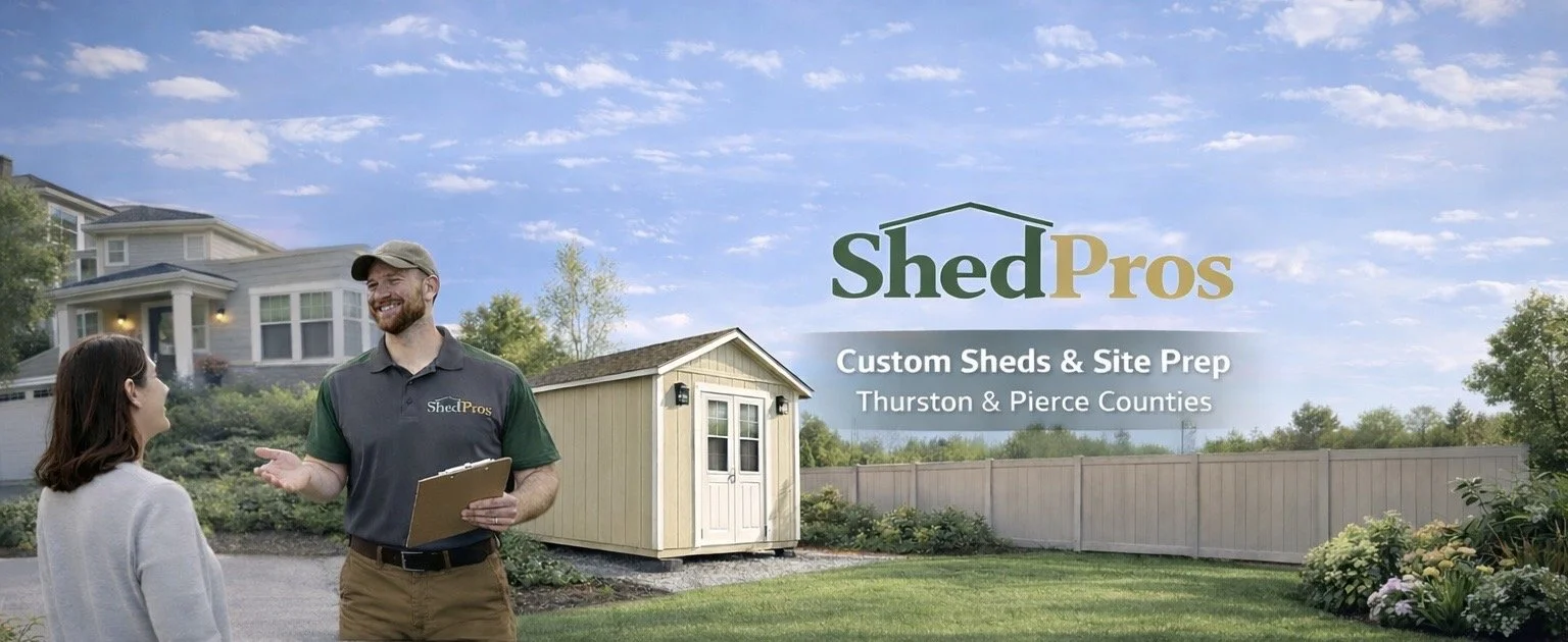 ShedPros provides full-service custom shed construction, site preparation, delivery, and installation throughout Thurston and Pierce County, including Olympia, Lacey, Tumwater, Shelton, and Tacoma. Whether you’re building a new shed, replacing an old one, or preparing a site for long-term stability, our team handles every step with care and professional precision.